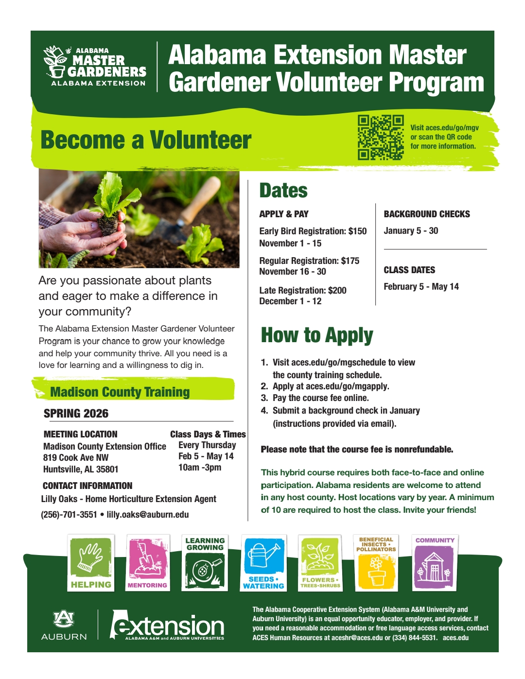 Master Gardeners are Extension-trained volunteer educators aiming to increase the availability of home horticulture information through qualified volunteers and to extend the land grant mission across Alabama.