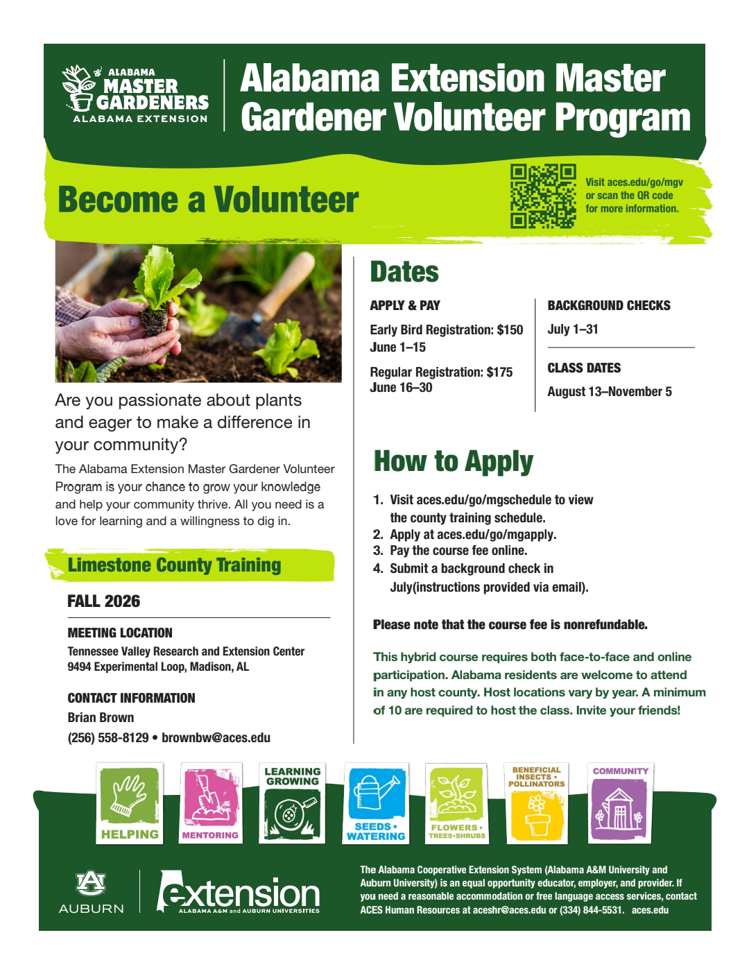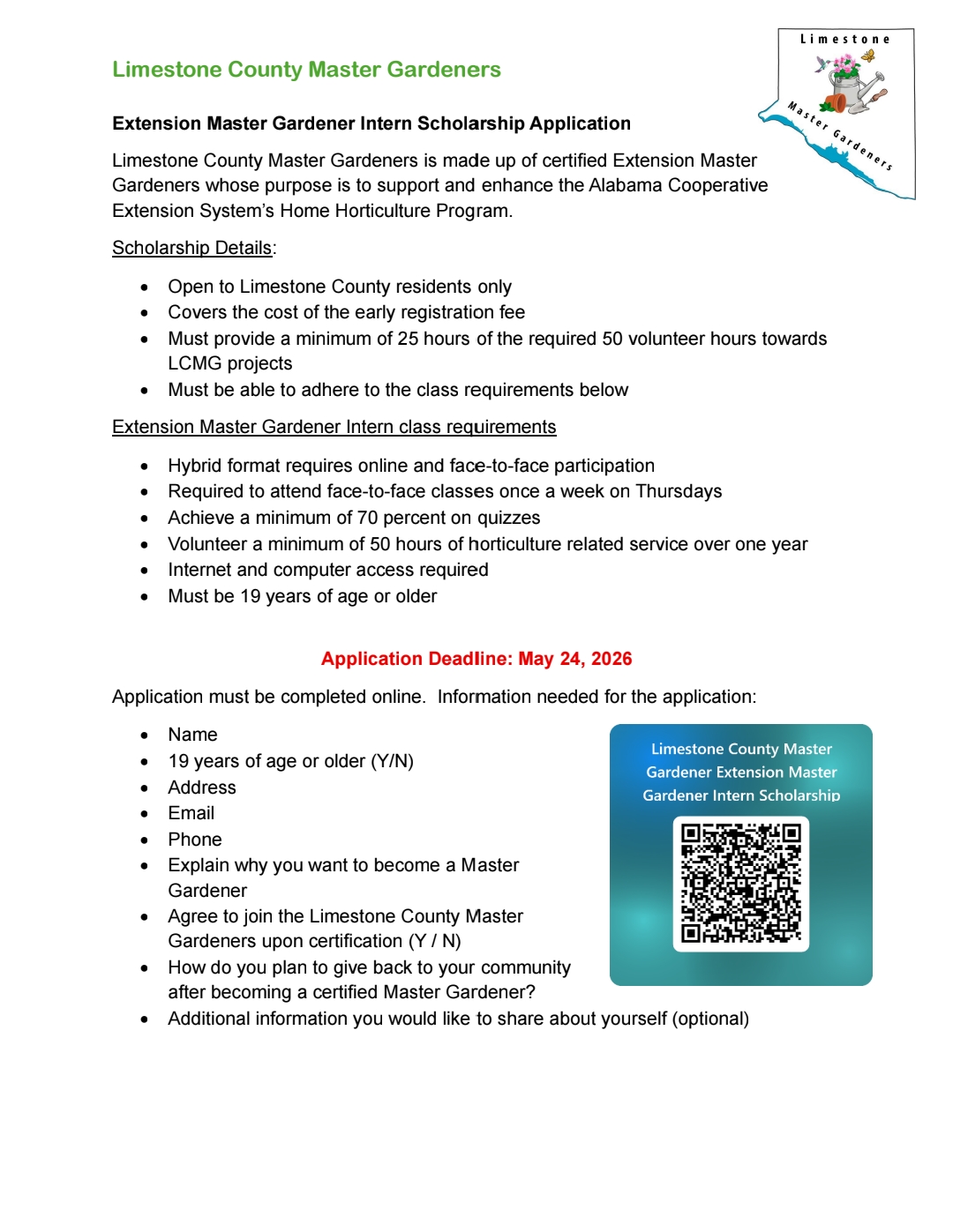 Each year, Limestone County members perform more than 7,500 hours of volunteer service that benefit the community. Alabama Master Gardeners donated 186,000 volunteer hours last year, while also taking 25,000 continuing education hours